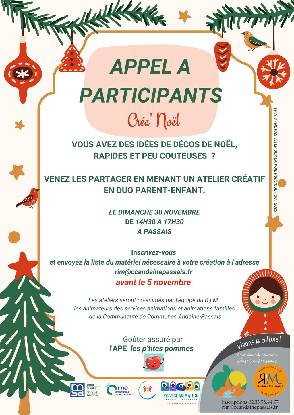 Proposez en duo parent-enfant votre atelier déco de Noël, envoyez la liste du matériel nécessaire avant le 5 novembre à l'adresse rim@ccandainepassais.fr