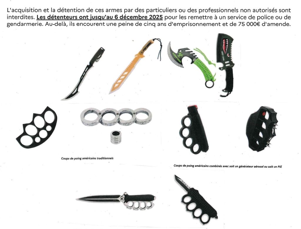 Les détenteurs de ce type d'armes ont jusqu'au 6 décembre 2025 pour les remettre à un service de police ou de gendarmerie ou à un professionnel autorisé. A défaut, la peine encourue est de 5 ans d'emprisonnement et 75.000 euros d'amende.