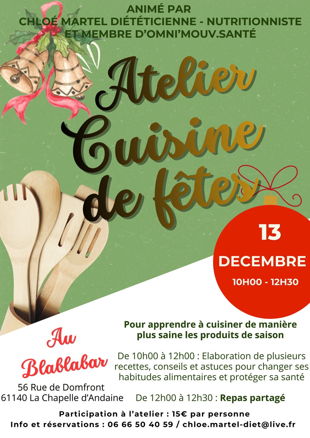Chloé Martel, diététicienne nutritionniste membre de l'association Omni'Mouv.Santé vous propose un atelier vous permettant de découvrir des recettes de fêtes de manière saine, que vous aurez le plaisir de préparer et de déguster ensemble.